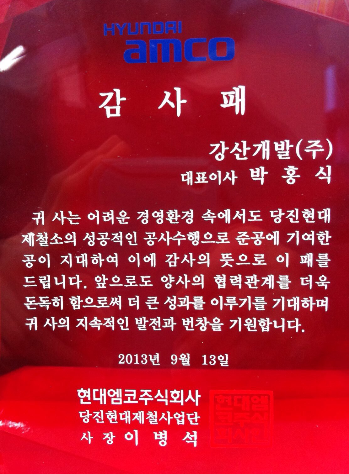당사는 현대엠코㈜로부터 당진제철소 3기 건설공사 기여 공로에 대한 감사패를 수여하였습니다.